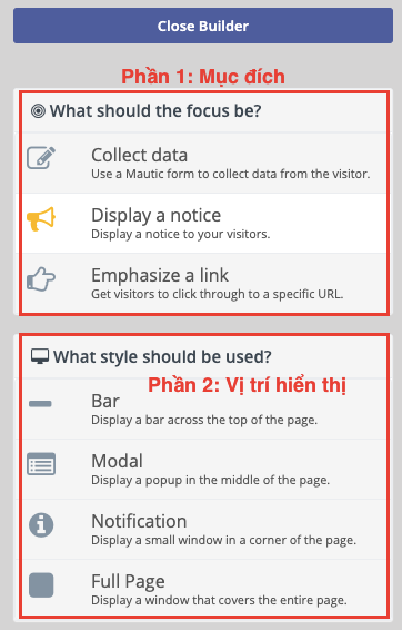 Đây là một tính năng mình thấy khá hay của Mautic. Focus Items giúp chúng ta tối ưu một mục đích nào đó khi User truy cập vào Website.
