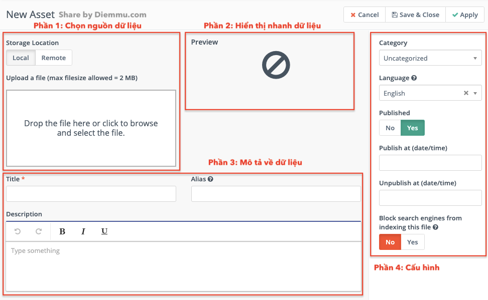 Phần 4: cấu hình các thông tin quan trọng cho tài sản như: lựa chọn Category, ngôn ngữ, chọn Publish hay không, thời gian tồn tại của tài sản này nếu có và cuối cùng là có cho phép công cụ tìm kiếm (Google, Bing, …) index file này hay không.