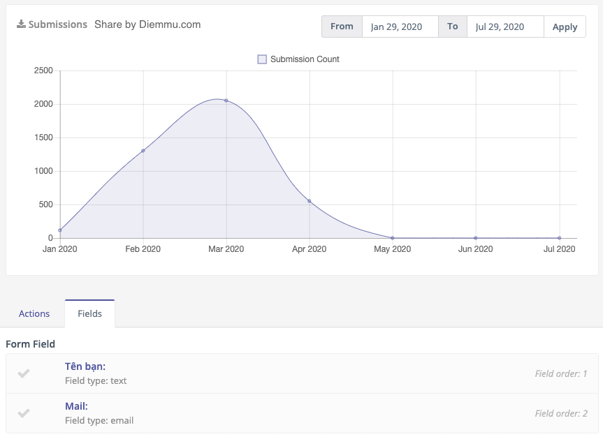 Đây là giao diện khi bạn tạo mới hay mở một Form trong Mautic. Nó sẽ hiển thị tổng quan về thông tin chi tiết của Form này như: số lượng Contact, thời gian submit, các trường (fields), các hành động (action) của form đó.