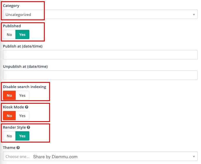 Published: chọn Yes. Nếu bạn có giới hạn thời gian hiệu lực của Form này thì cấu hình thời gian bắt đầu kết thúc tại Published at/Unpublished at.