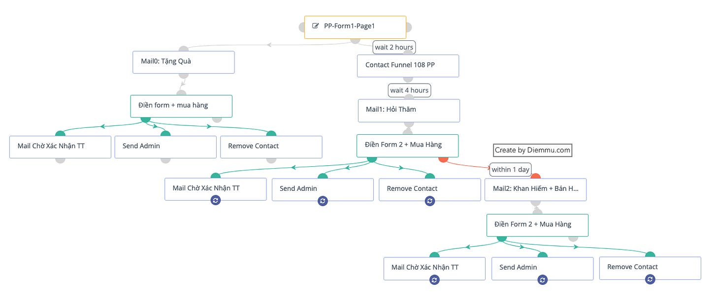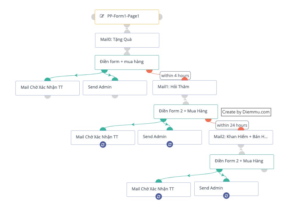 Mai 0, Mail 1, Mail 2, ... trong đó đều dẫn đến Sale Page để bán hàng. Nếu khách hàng đã mua hàng ở bước nào rồi thì các bước sau dừng, không gửi tiếp nữa.