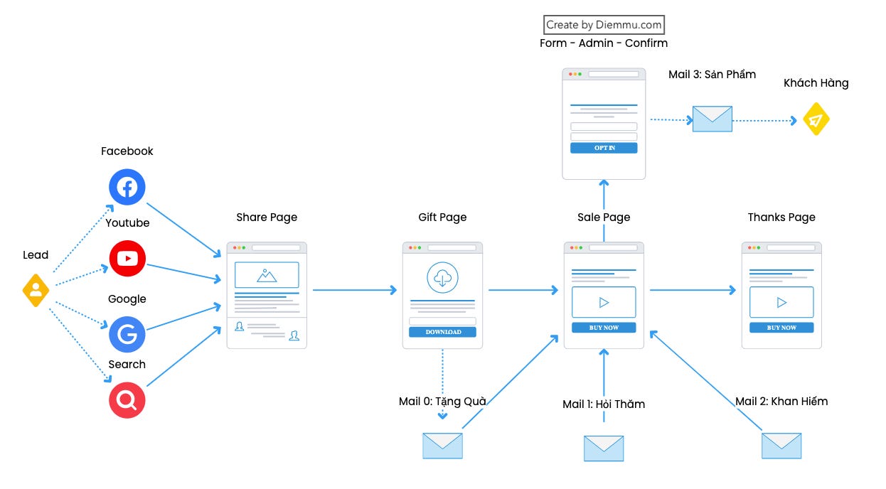 Khách hàng tiềm năng (Lead) từ nhiều nguồn khác nhau: Facebook, Youtube, Google, Search, ... truy cập vào Share Page. Share Page là trang chia sẻ giá trị nào đó nhằm thu hút khách hàng tiềm năng và chuyển họ sang trang Gift Page.