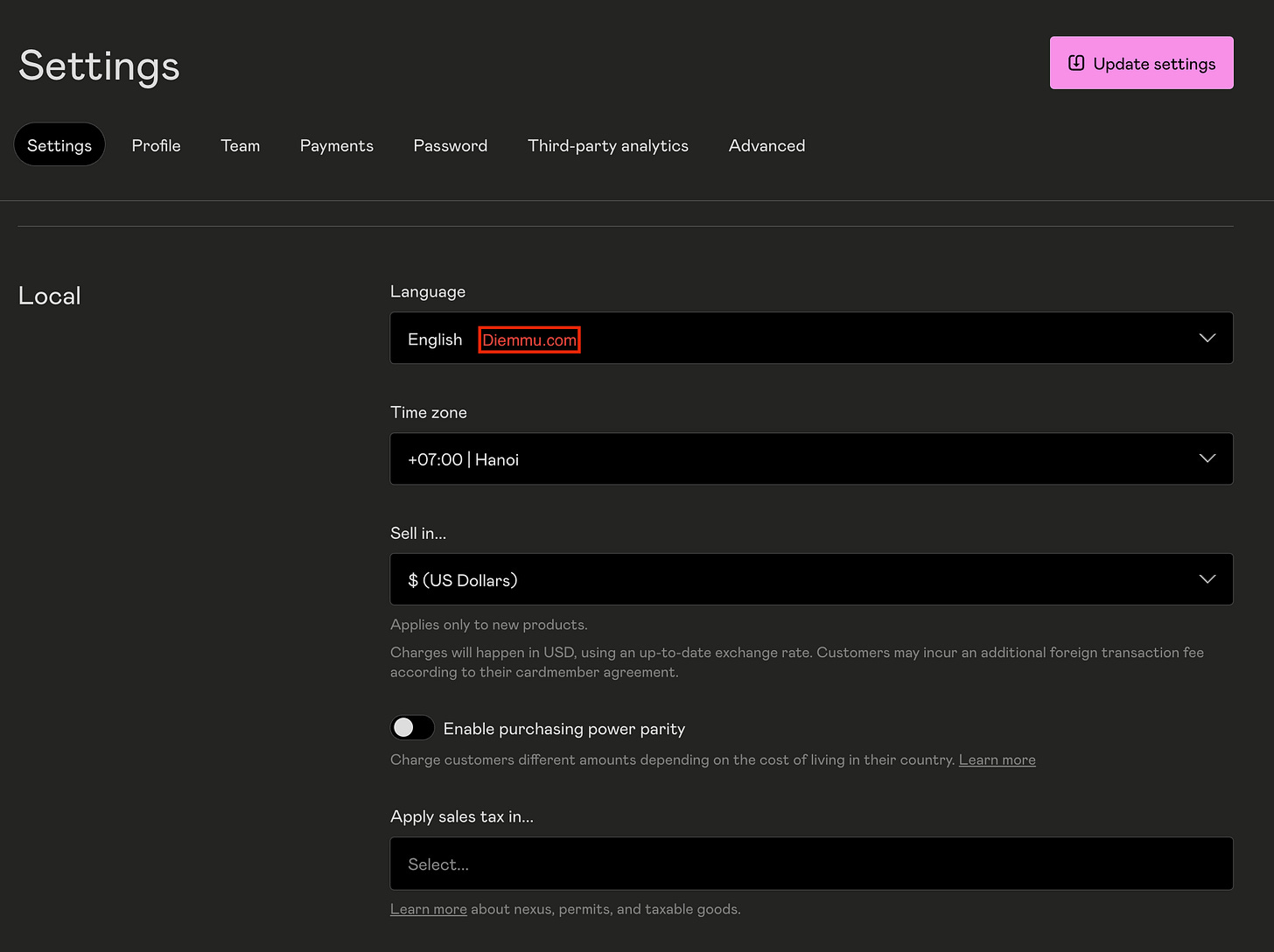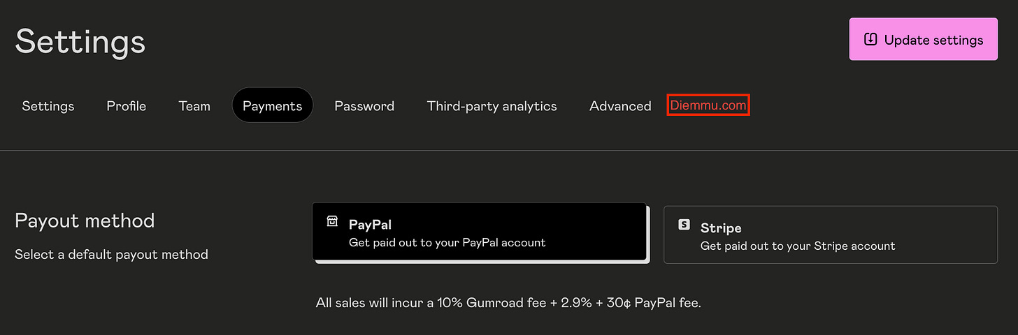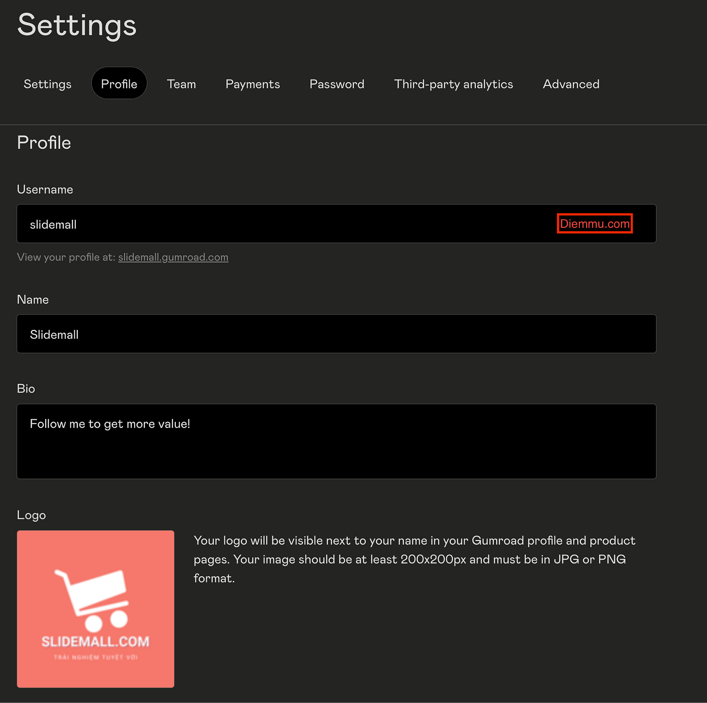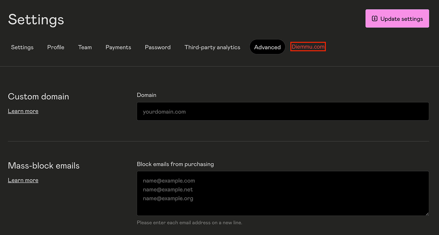 Ở Tab cuối cùng: Advanced. Bạn sẽ được cấu hình tên miền riêng rất đơn giản. Tuy nhiên, như mình đã nói trước đây, mình sẽ để nguyên tên miền Gumroad để tận dụng thương hiệu của nền tảng này.