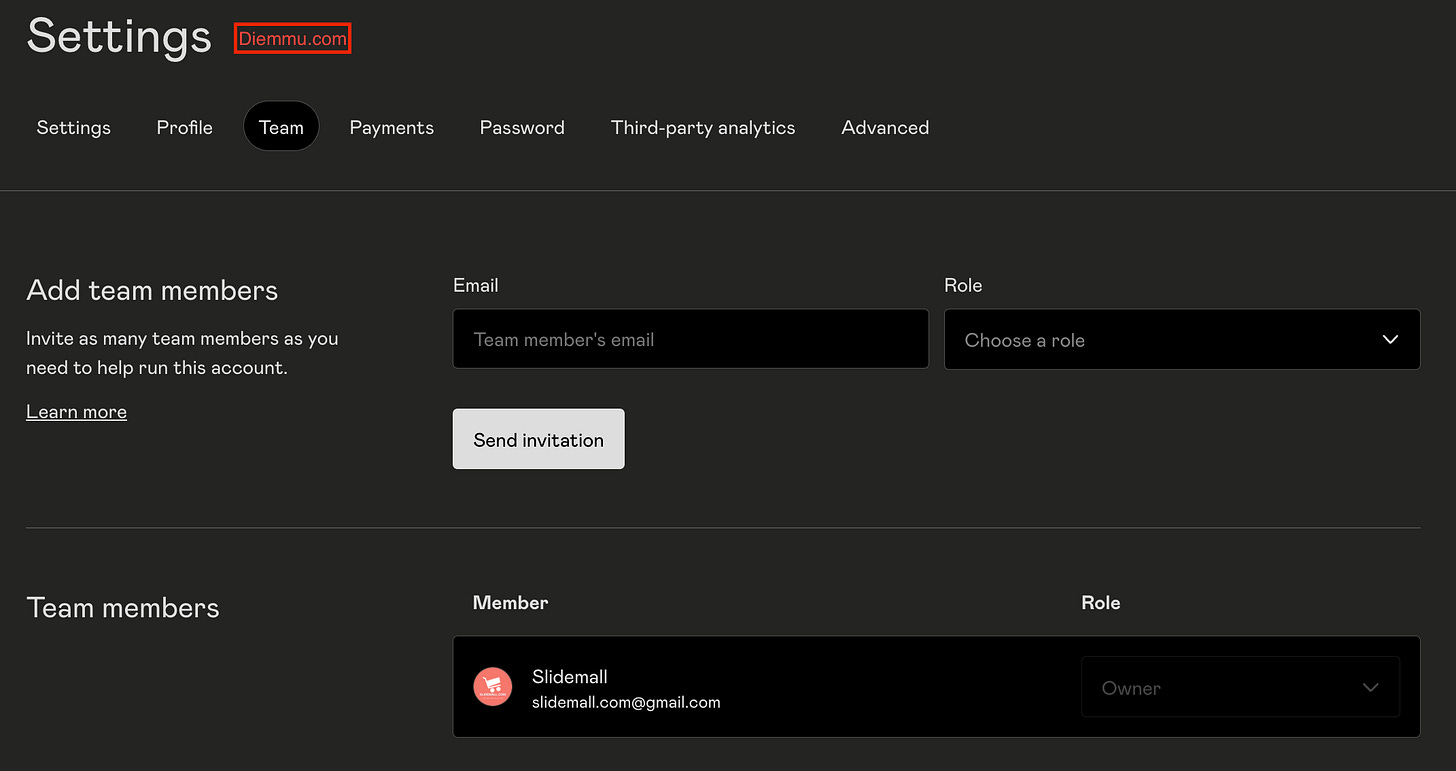Tiếp theo là Tab: Team. Tại đây bạn có thể thêm không giới hạn đối tác, nhân viên của bạn và phân quyền cho họ với những chức năng riêng biệt.