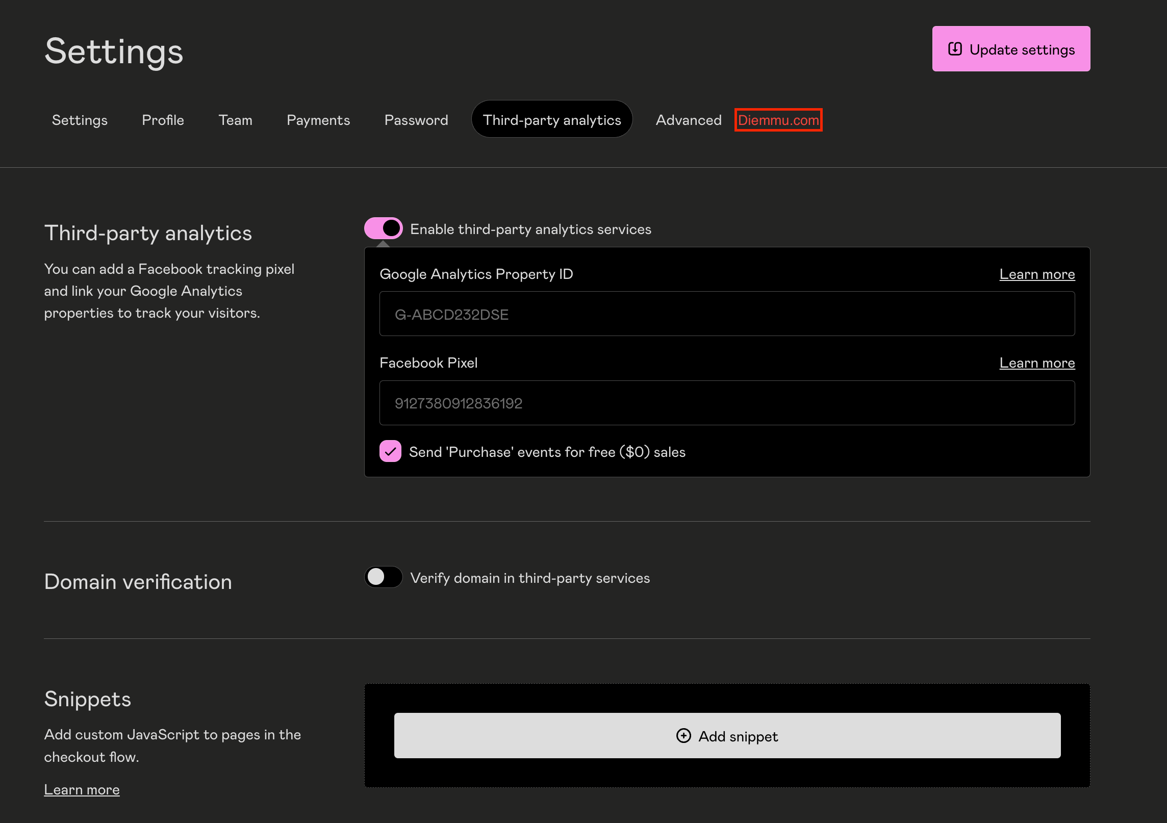 Tại Tab: Third-party analytics: tại đây bạn sẽ cấu hình đo lường hành vi khách hàng truy cập vào Store của chúng ta. Mặc định Gumroad sẽ cho bạn nhập mã Google Analytics và Facebook Pixel, bạn có thể thêm các nền tảng khác như Tiktok, ... ở phần Snippets.