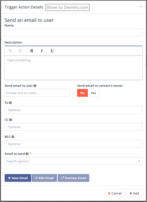 Phần này có chức năng cực hay đó là: Send an email to user. Nó giúp cho chúng ta sẽ cài đặt được tự động gửi Mail thông báo đến Admin hoặc Sale hoặc Marketing khi có bất cứ một Contact nào đạt đến số điểm nhất định.