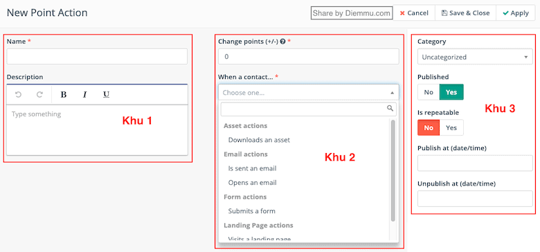 Khu 2: lựa chọn +/- số điểm, tùy vào hành động của Contact bạn có thể gắn +/- số khác nhau. Các hành động bạn chọn tương ứng trong phần: When a contact…