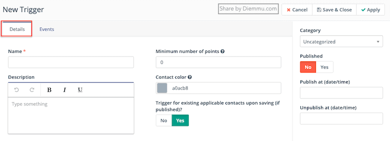 Tại Tab: Detais bạn điền các thông tin cơ bản như Name, Description, Category và Publish.