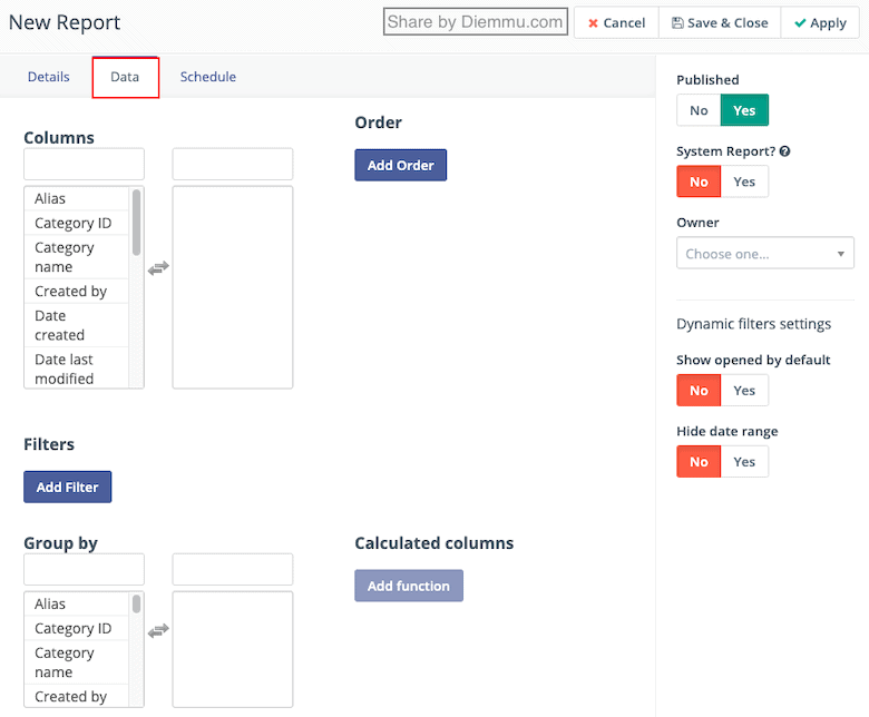 Ở Tab tiếp theo: Data thì Mautic sẽ cho phép bạn tùy chọn từng cột dữ liệu để làm Reports.