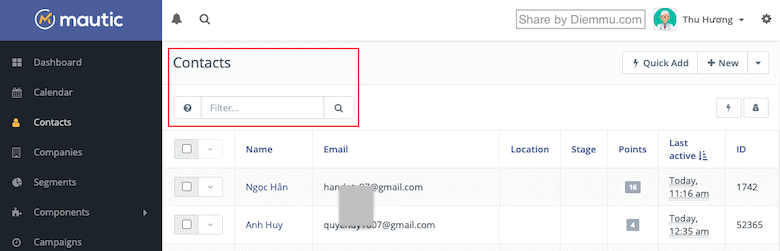 Để truy xuất dữ liệu nhanh thì Mautic cung cấp cho chúng ta một bộ Search vô cùng mạnh mẽ. Với một ô Search nhỏ gọn bạn có thể tìm thấy bất cứ Contacts nào trong hệ thống mà bạn muốn chỉ với vài cú pháp.